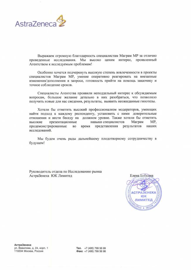 Astra Zeneca 24.07.2018 Хотели бы отметить высокий профессионализм модераторов, умеющих найти подход к каждому респонденту, установить с ними доверительные отношения и вести беседу на должном уровне.