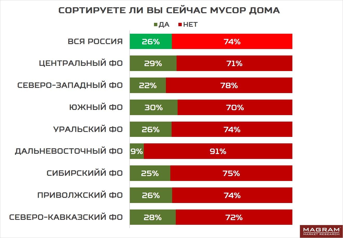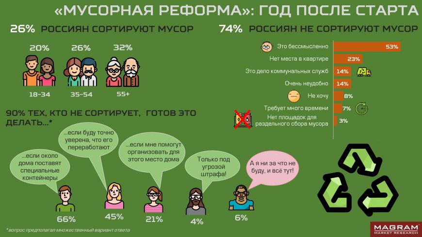 Независимое исследовательское агентство MAGRAM Market Research узнало, как россияне относятся к сортировке мусора через год после начала реформы. В январе этого года агентство провело всероссийский опрос, в котором приняли участие 2500 человек в возрасте от 18 лет. Выборка репрезентирует мнение населения всех федеральных округов РФ.