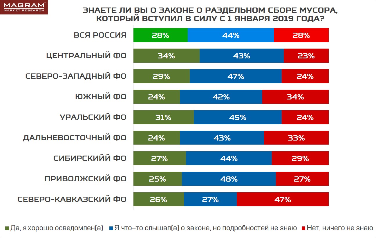 В целом, россияне неплохо осведомлены о законе о раздельном сборе мусора: ничего о нем не слышали лишь 28% респондентов, 44% слышали о нем, но не знают подробностей и 28% хорошо знают закон.