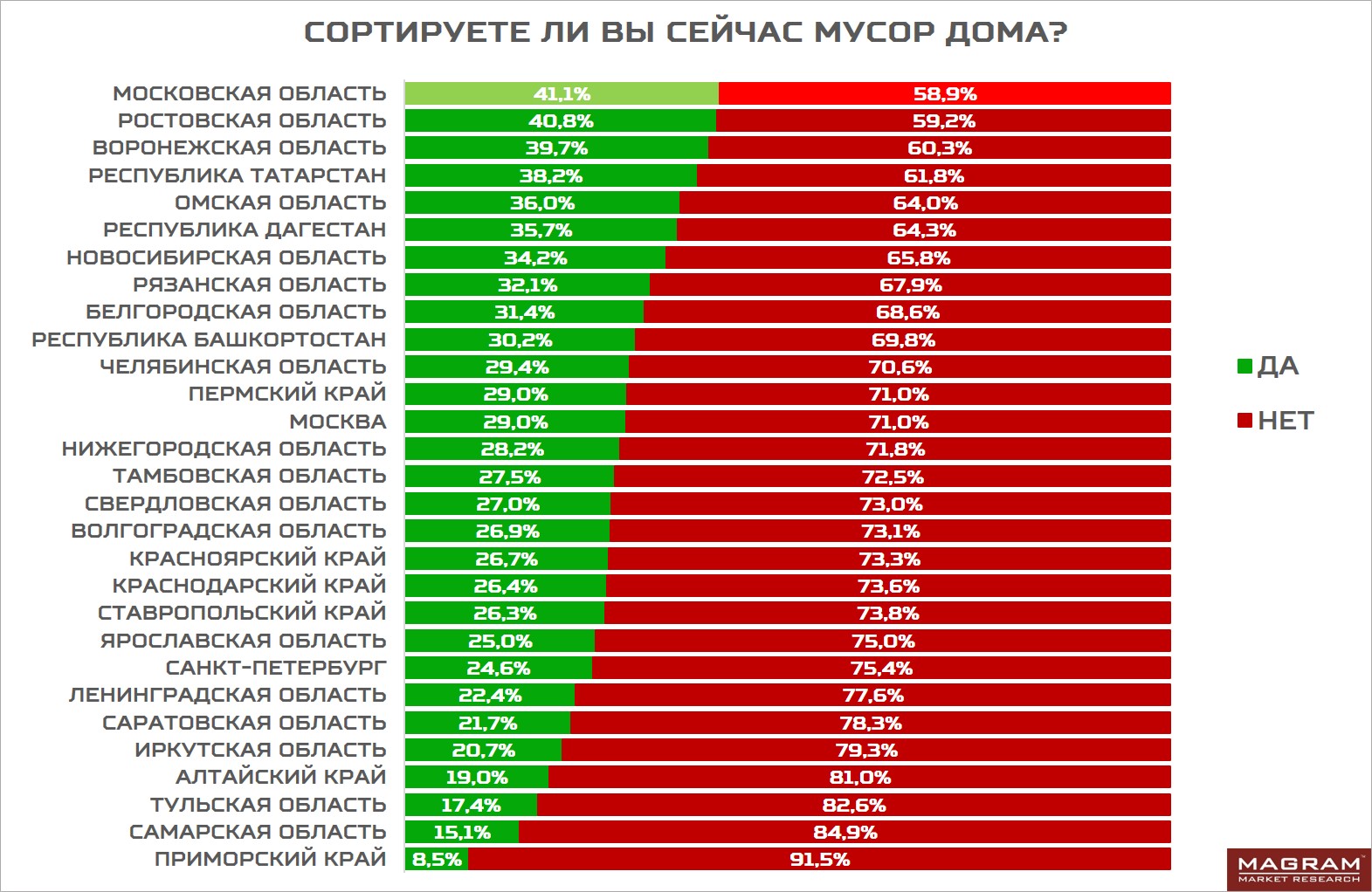 Среди российских регионов, принявших участие в опросе, лидирует Московская область, в которой «мусорная реформа» вступила в силу в январе 2019 года. В результате уже сегодня 41% жителей Подмосковья сортируют мусор (среди всех жителей РФ этот показатель составляет 26%).