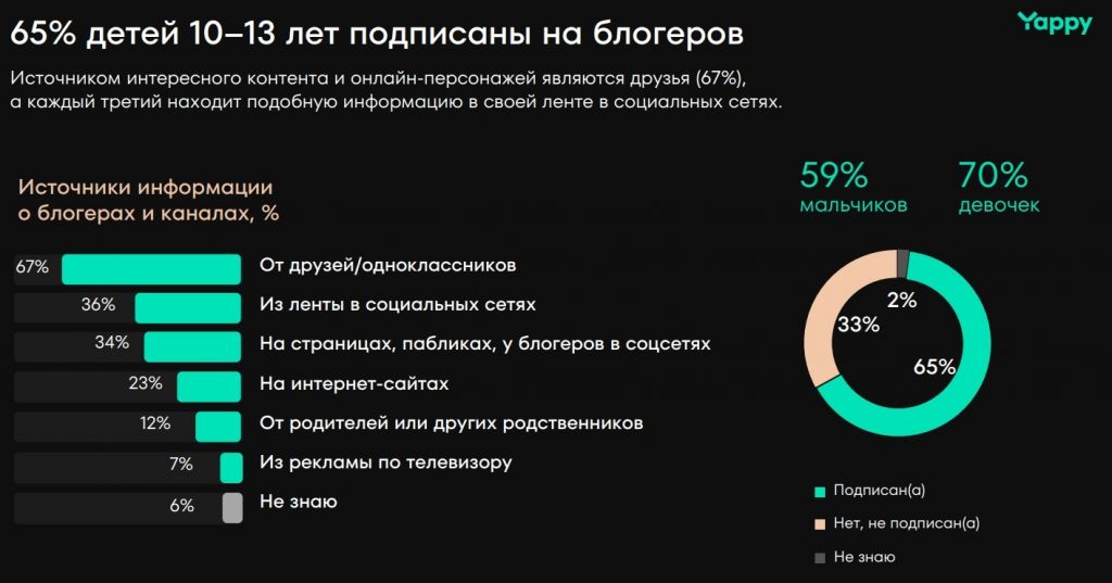 По данным исследования, 65% респондентов в возрасте 10-13 лет подписаны на какой-либо канал или блогера (причем показатель выше среди девочек: 70% против 59%). При этом дети положительно относятся к блогингу. По их мнению, блогеры могут много зарабатывать, их профессия творческая, позволяющая продемонстрировать свои способности. А родители указывают в два раза чаще, чем сами дети, что поколению альфа неинтересны блогеры — 41% против 19%.