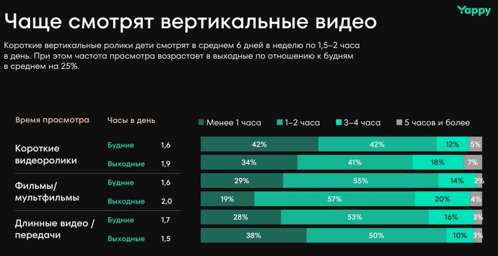 Короткие вертикальные ролики дети смотрят в среднем 6 дней в неделю по 1,5-2 часа в день. В целом, сами дети указывают на более длительный просмотр, нежели полагают их родители. А девочки ежедневно тратят на такой контент на 10-20 минут больше, чем мальчики.