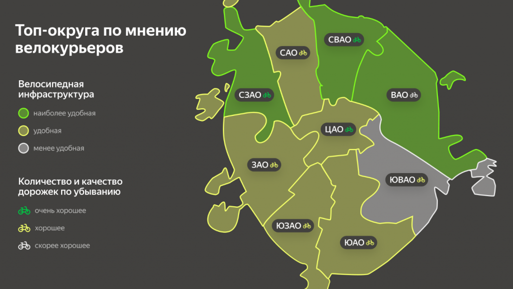 Курьеры положительно оценили велоинфраструктуру Москвы. Наиболее удобными для перемещения округами стали СЗАО, СВАО и ВАО. По количеству и качеству велодорожек лидируют СЗАО и ЦАО.