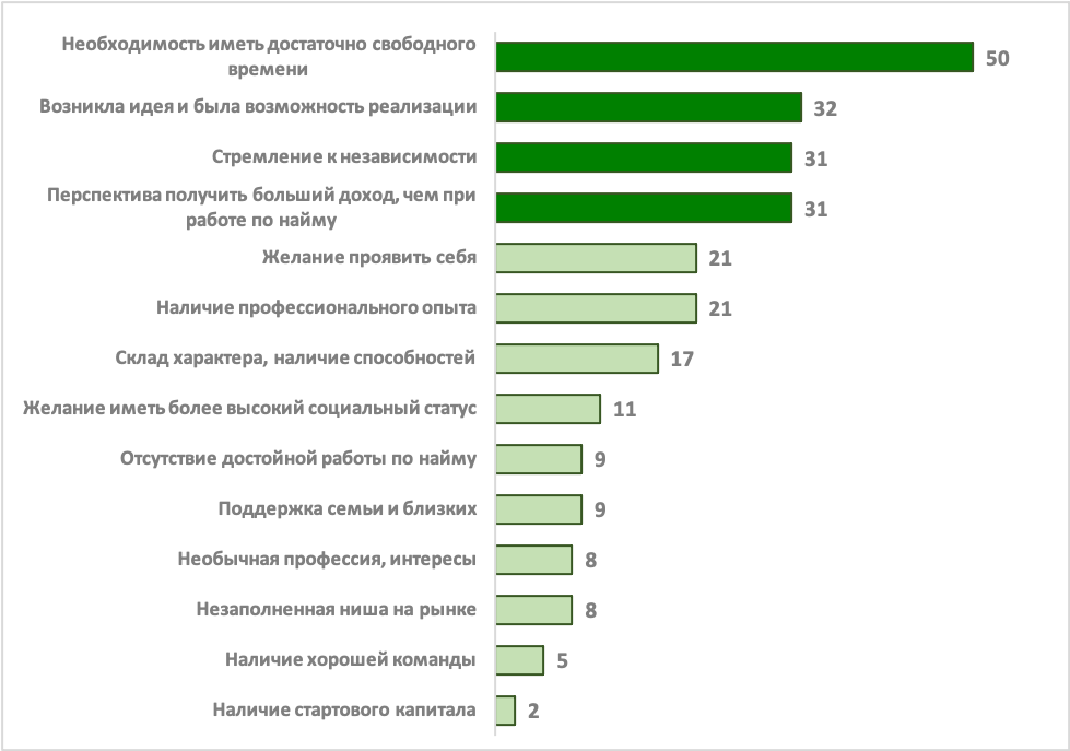 Также распространенной причиной создания бизнеса является возможность реализации интересной идеи. 31% опрошенных решили стать независимыми, еще 31% рассчитывают на больший доход, чем при работе по найму. 21% опрошенных желают таким образом проявить себя.