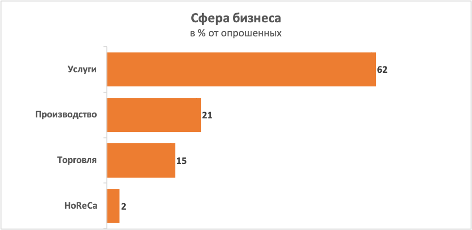 Среди опрошенных 62% имеют свой бизнес в сфере услуг, 21% - в производстве, 15% - в торговли и 2% - в гостинично-ресторанной отрасли.