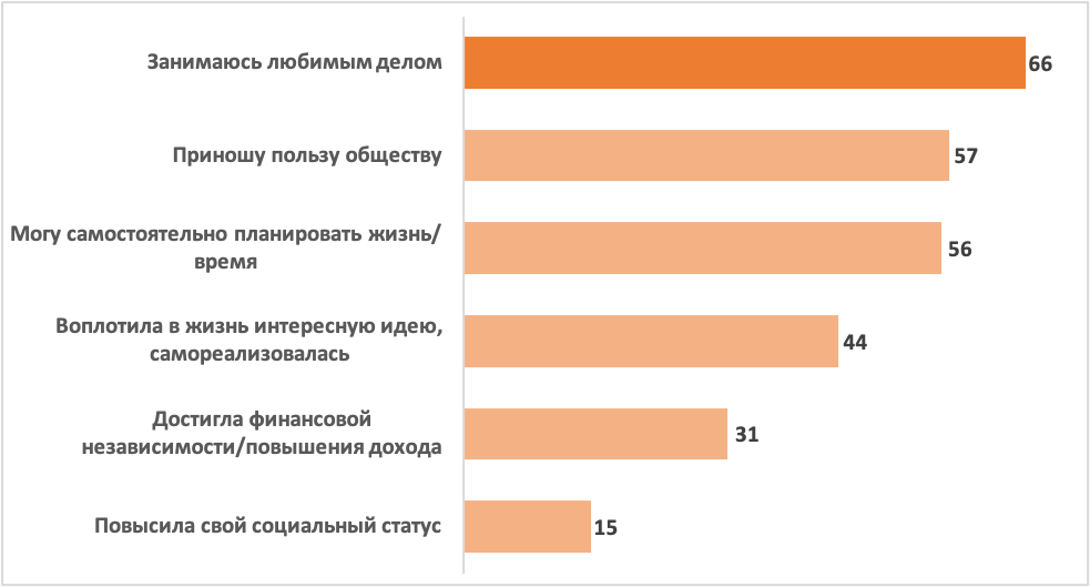 65% женщин считают свой бизнес успешным. При этом для большинства опрошенных успех их бизнеса заключается в реализации любимого дела (66%). 57% считают, что успех заключается в пользе обществу, 56% видят в успехе независимость и возможность самостоятельного планирования жизни. Самым успешным свой бизнес назвали те, кто сосредоточился на бизнесе в первую очередь (70%), тогда как среди тех, кто совмещают ведение бизнеса с работой по найму такой ответ встречался в 52% случаев.