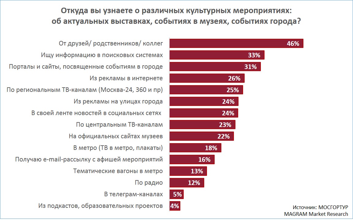 Основным источником информации о культурных мероприятиях названо «сарафанное радио» — 46% респондентов узнают о выставках, музейных событиях и пр. от друзей, родственников и знакомых. Так же популярны интернет-ресурсы — 33% ищут информацию в поисковиках, 31% — на специализированных порталах.