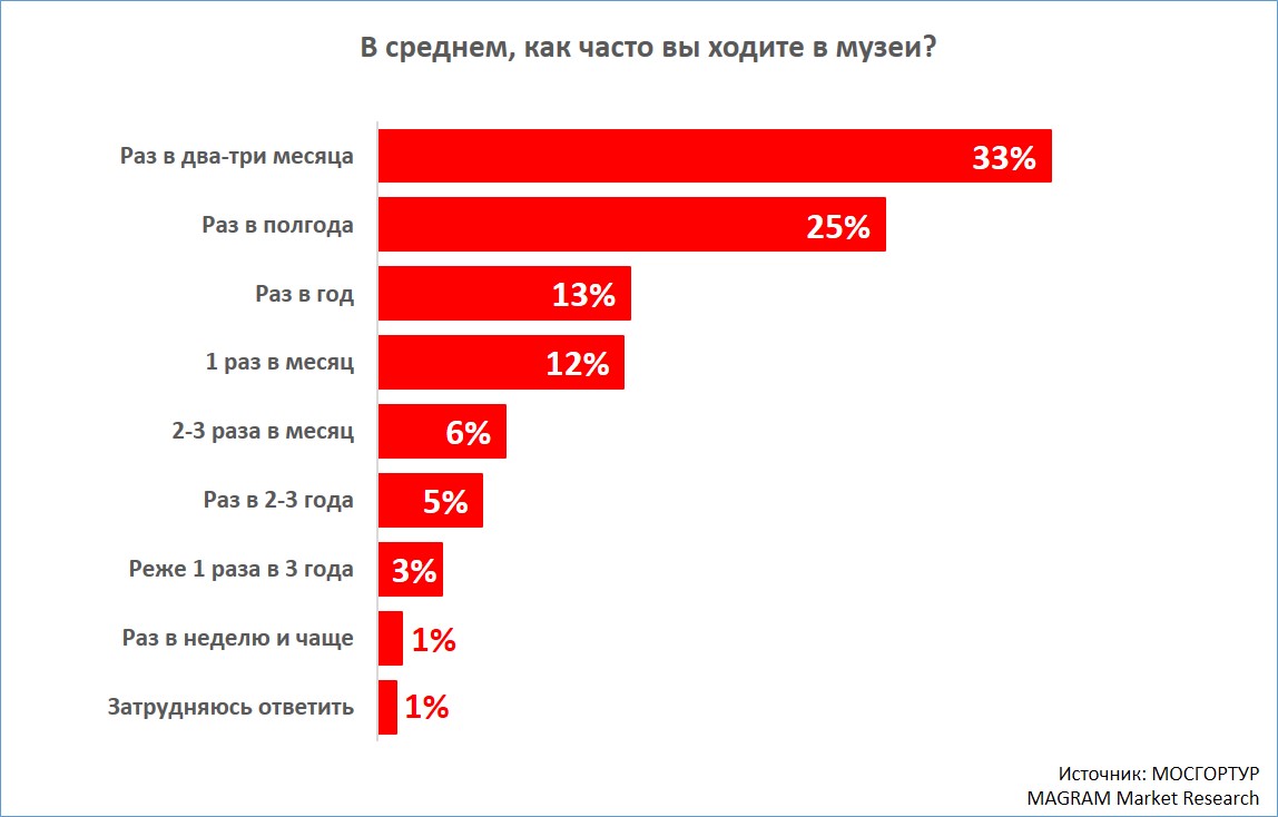 Среди активных посетителей 33%, в среднем, ходят в музеи раз в 2-3 месяца, 25% раз в полгода и 13% раз в год.