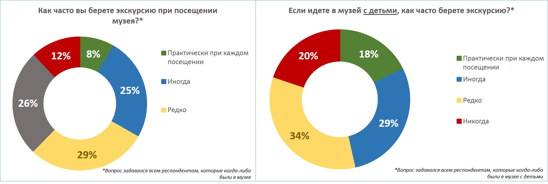 Экскурсии не пользуются большой популярностью у участников опроса. Однако посетители с детьми берут экскурсии значительно чаще.